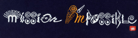 As little as an apostrophy may be, introduced into "Mission Impossible" at the proper spot, it changes it's meaning into a strong positive message: "Mission I'mpossible". In daily life a subtle change in our point of view can bring up unthought of solutions. Sometimes a small change is all it takes to move mountains.The Artwork of this logo was designed so that each letter represents an aspect of the global message. The steering wheel reminds us to take control of our own lives; let your relationships be in harmony as symbolized by two people dancing closely together; the halo around their heads shows that these two figures have integrated their higher self, their divinity; the bow reminds us that the arrow follows the intention of the archer; and imagine, as in the song of John Lennon, that the globe symbolizes global harmony; welcome the solid base, as drawn in the letter m, wherefrom the spiral of limitless communication of the I can soar up, with or without the net. Together they confirm "I am"! Her we have encountered our true being. We open the doors wide for it to blossom and express our awakening with no restraints in our daily life.